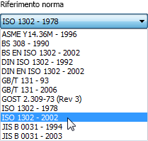 Lo stile Simbolo di stato della superficie è stato aggiornato per fornire i formati di simbolo corrispondenti ad alcune norme di disegno. Quando si definisce uno stile Stato della superficie, nell'Editor stili e norme, selezionare la norma desiderata dall'elenco Riferimento norma.