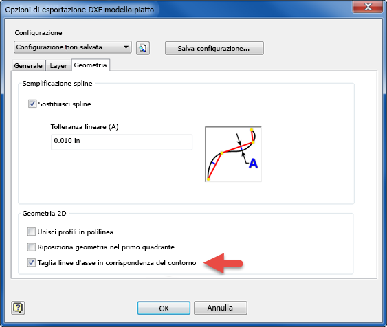 Non era possibile utilizzare file di modello piatto DWG o DXF esportato con alcuni prodotti di terze parti, se una linea d'asse della piega incrociava un foro nella piega. È stata aggiunta una nuova opzione alla scheda Geometria nella finestra di dialogo Opzioni di esportazione DXF modello piatto o Opzioni di esportazione DWG modello piatto. Selezionare la nuova opzione Taglia linee d'asse in corrispondenza del contorno nella scheda Geometria per tagliare le linee d'asse delle pieghe allo spigolo del taglio.