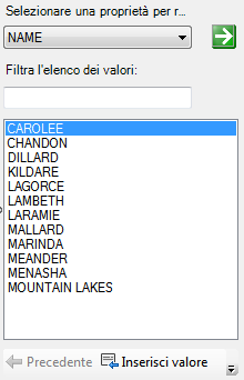 - Per filtrare l'elenco, immettere i caratteri di filtro in Filtra l'elenco dei valori. Ad esempio, immettere ill per trovare Dillard e Fillmore. Fare clic sulla freccia verde. Nell'elenco vengono visualizzati tutti i valori contenenti i caratteri digitati.