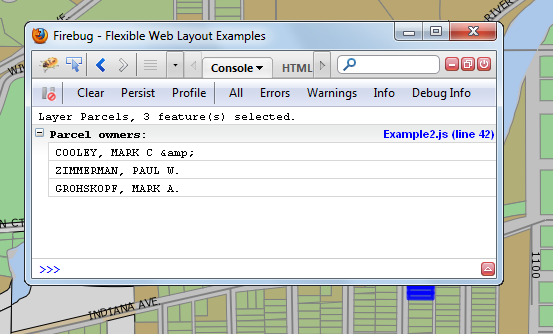 Example2.js combines these concepts to write the owner names of selected parcels to the Firebug console.