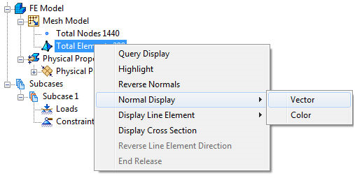 Tutti i risultati degli elementi Shell si trovano nel sistema di coordinate degli elementi. È importante tenere presente questo perché se si desidera una sollecitazione di direzione, è necessario mappare la direzione della direzione x dell'elemento utilizzando un orientamento del materiale. La direzione x di default dell'elemento si basa sull'ordine dei nodi degli elementi Shell. Poiché il modulo di creazione automatica delle mesh "collega i punti" in modo consecutivo, le direzioni x dell'elemento possono terminare in molti modi diversi in un piano. L'output per gli elementi Shell consiste in un valore superiore e in uno inferiore. Ciò è utile perché la parte superiore può essere compressa, mentre la parte inferiore è in tensione. La parte superiore e inferiore sono specificate dall'asse z dell'elemento. Questo vettore può essere visualizzato facendo clic con il pulsante destro del mouse su Totale elementi, quindi su Visualizzazione normale e su Vettore o Colore. È possibile invertire i vettori normali degli elementi.