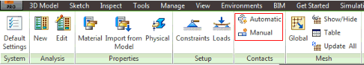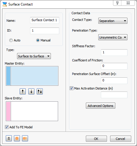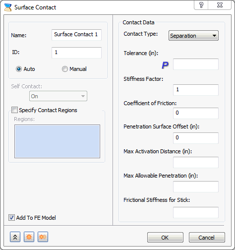 Fare clic sul pulsante Automatico o Manuale nel riquadro Contatti sulla barra multifunzione oppure fare clic con il pulsante destro del mouse su Contatti di superfici nella parte superiore della struttura Modello e scegliere Nuovo per aprire le finestre seguenti.