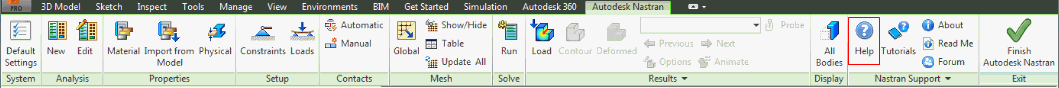 . Viene visualizzata la barra multifunzione Autodesk Nastran. A questo punto, fare clic sul pulsante Guida nel pannello Supporto Nastran.