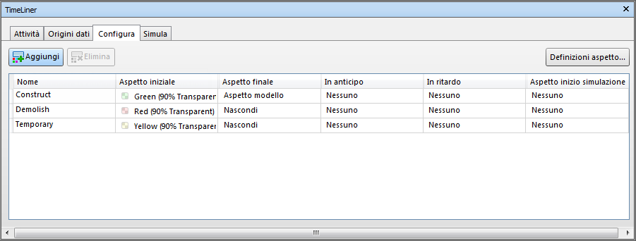 - Costruzione: per le attività dove gli elementi associati devono essere costruiti. Per default, durante una simulazione, gli oggetti vengono evidenziati in verde all'inizio dell'attività e reimpostati su Aspetto modello alla fine dell'attività.