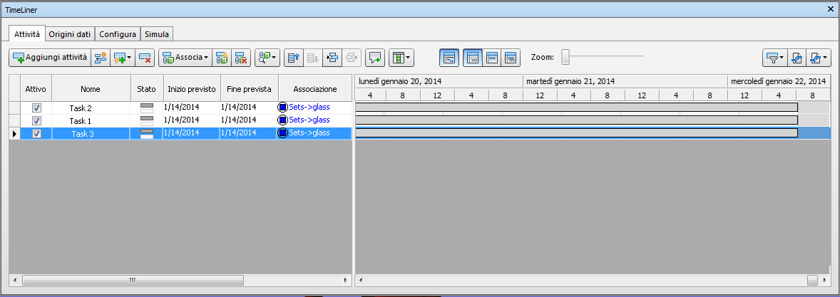 Nella vista scena le attività possono essere associate alla selezione corrente oppure a qualsiasi gruppo di selezione o di ricerca. È inoltre possibile trascinare direttamente gli elementi dalla vista scena, dalla finestra Gruppi e dalla struttura di selezione a un'attività. Il tipo di associazione viene visualizzato nella colonna Associazione. Per default, questa colonna è posizionata dopo Tipo attività,ma può essere spostata prima della colonna Inizio.