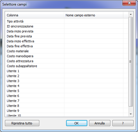 La finestra di dialogo Selettore campi per l'importazione di dati da un software di pianificazione esterno