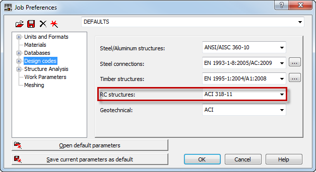 6. Click Design Codes in the left pane of the dialog, and then ensure that the ACI 318-11 code is selected for the RC structures list.