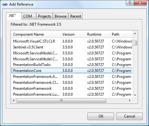4. Add the PresentationCore reference:
