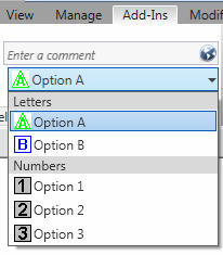 The following image shows a ribbon panel on the Add-Ins tab using various ribbon panel controls. The following sections describe these controls in more detail and provide code samples for creating each portion of the ribbon.