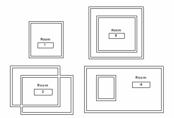 The size of the segment list depends on the enclosed region topology. Each BoundarySegment list makes a circuit or a continuous line in which one segment joins the next. The following pictures provide several examples. In the following pictures, all walls are Room-Bounding and the model lines category is OST_AreaSeparationLines. If an element is not Room-Bounding, it is excluded from the elements to make the boundary.