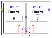 In the following pictures, five doors are inserted into walls without flipping the facing. The table lists the FromRoom, ToRoom, and Room properties for each door. The Room property belongs to all Family Instances.