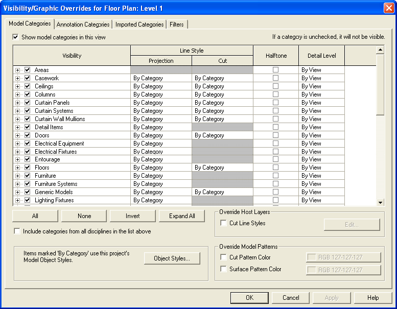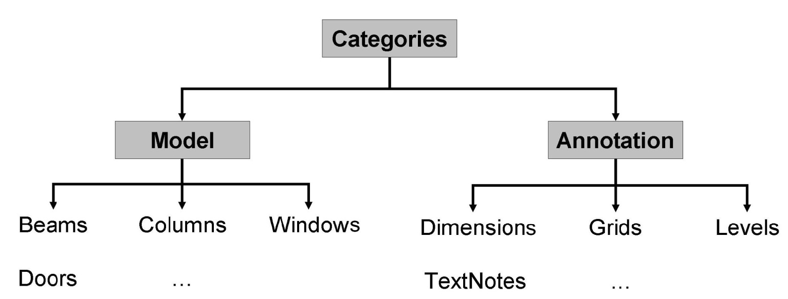 Categories are the most general class. The Document.Settings.Categories property is a map that contains all Category objects in the document and is subdivided into the following: