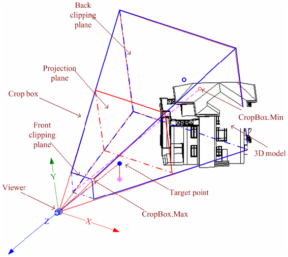 The perspective view crop box is part of a pyramid with the apex at the viewer position. It is the geometry between the two parallel clip planes. The crop box bounds the portion of the model that is clipped out and projected onto the view plane.