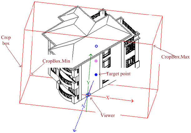 Isometric views are generated using parallel projection rays by projecting the model onto a plane that is normal to the rays. The viewing coordinate system is similar to the perspective view, but the crop box is a parallelepiped with faces that are parallel or normal to the projection rays. The View.CropBox property points to two diagonal corners whose coordinates are based on the viewing coordinate system.