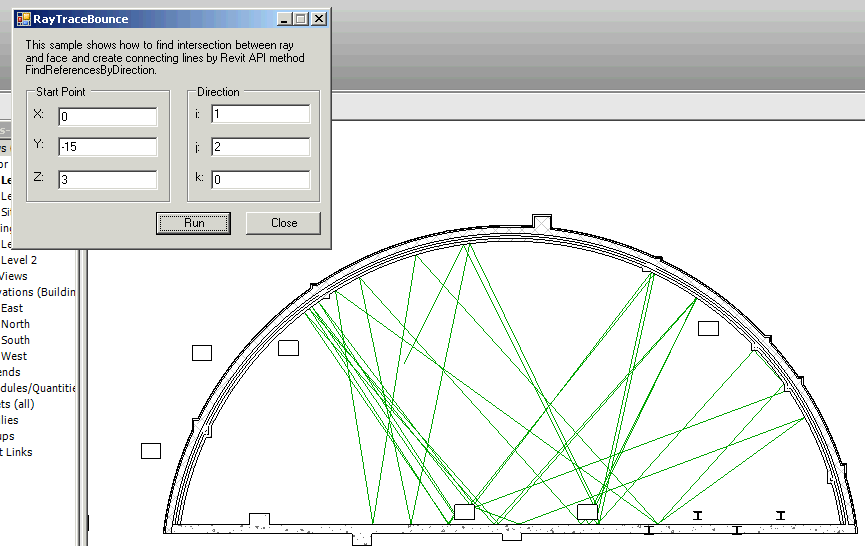 The references returned by ReferenceIntersector.Find() include the intersection point on the geometry. Knowing the intersection point on the face, the face’s material, and the ray direction allows an application to analyze reflection and refraction within the building. The following image demonstrates the use of the intersection point to reflect rays intersected by model elements; model curves were added to represent the path of each ray.