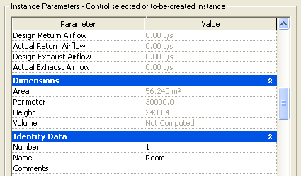 Every element has a set of parameters that users can view and edit in Revit. The parameters are visible in the Element Properties dialog box (select any element and click the Properties button next to the type selector). For example, the following image shows Room parameters.