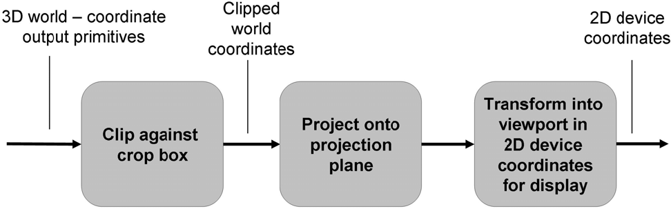 Some portions of a 3D model space that do not display, such as those that are behind the viewer or are too far away to display clearly, are excluded before being projected onto the projection plane. This action requires cropping the view. The following rules apply to cropping:
