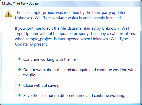 If a document is modified by a non-optional updater and later loaded when that updater is not installed, a task dialog similar to the following is displayed: