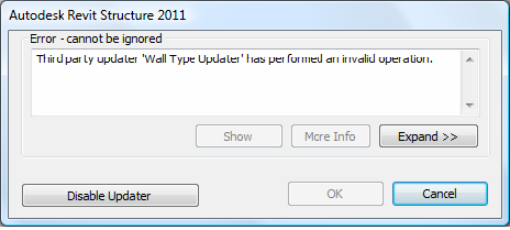 If an updater attempts to edit the same parameter of an element that was updated by another updater in the same transaction, or if an updater attempts to edit the geometry of an element in a way that conflicts with a change made by another updater, the updater is canceled, an error message is displayed and the user is given the option to disable the updater.