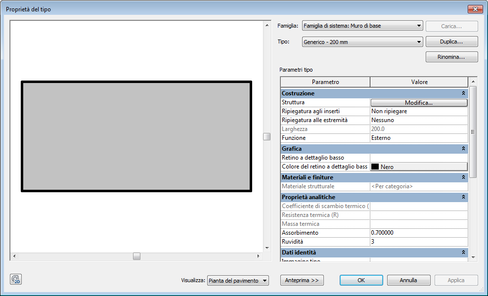 Di seguito è raffigurato un esempio di finestra di dialogo Proprietà del tipo relativa ad un tipo di muro, con il riquadro Anteprima visualizzato.