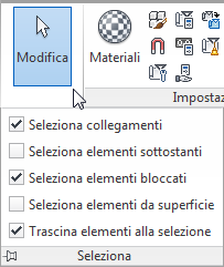 Seleziona elementi da superficieL'opzione Seleziona elementi da superficie consente di selezionare elementi facendo clic sulle relative superfici interne anziché sui bordi. Ad esempio, è possibile attivare l'opzione per selezionare un muro o un pavimento mediante clic in corrispondenza del rispettivo centro.