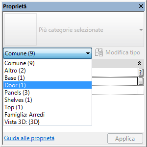 Immediatamente sotto il Selettore di tipo è disponibile un filtro per identificare la categoria degli elementi inseriti da uno strumento, oppure la categoria e il numero di elementi selezionati nell'area di disegno. Se sono state selezionate più categorie o tipi, nella tavolozza vengono visualizzate solo le proprietà comuni a tutte le istanze. Se sono selezionate più categorie, utilizzare l'elenco a discesa del filtro per visualizzare solo le proprietà relative ad una categoria specifica o alla vista stessa. La selezione di una categoria specifica non interessa l'intero gruppo di selezione.