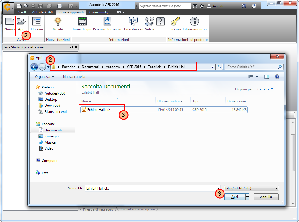 2. Nel gruppo Avvia, fare clic su Apri e selezionare C:\Utenti\Pubblica\Documenti pubblici\Autodesk\CFD 2016\Tutorials\Exhibit Hall.
