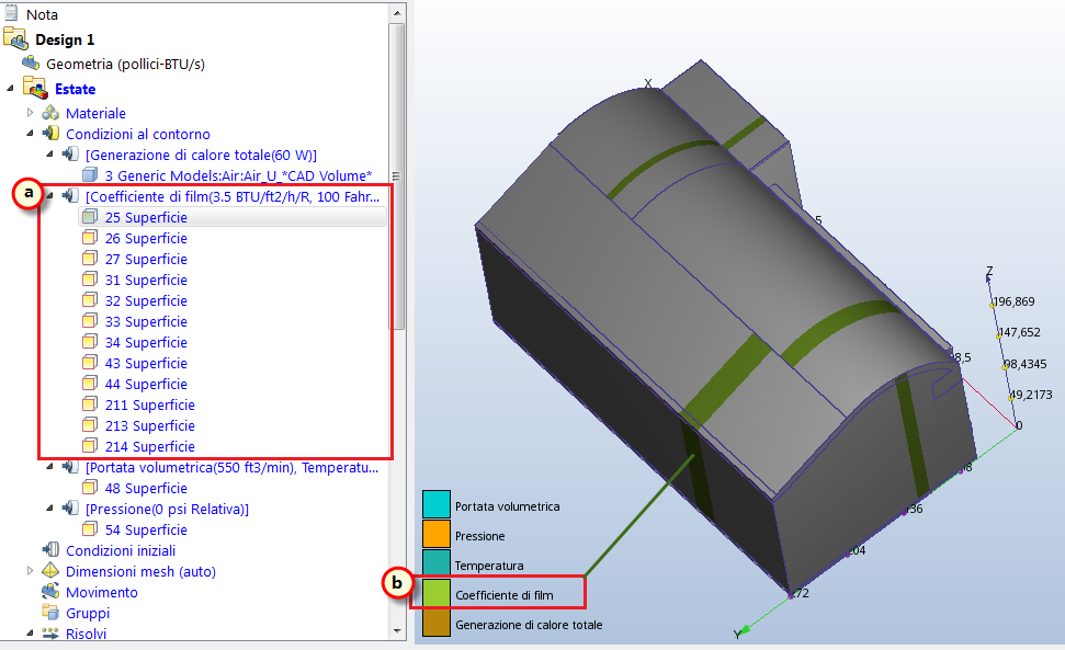 15. Per verificare che la condizione al contorno del coefficiente di film sia applicata correttamente alle superfici esterne, controllare la barra Studio di progettazione e la striscia colorata sulle superfici: