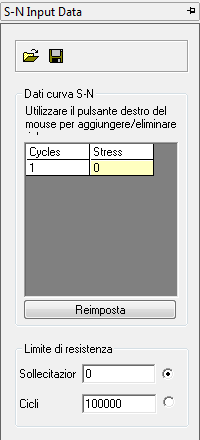 Fare clic con il pulsante destro del mouse nella tabella per inserire una riga, eliminarne una o reimpostare (cancellare) la tabella. È inoltre possibile importare la tabella da un file con valori delimitati da virgole (*.csv) o esportarla in un file di questo tipo. Esistono due campi posti sotto la tabella per definire il limite di resistenza: Sollecitazione e Cicli. Immettere un valore: l'altro verrà calcolato dal programma. Il pulsante di opzione a destra di ciascun campo specifica la quantità che verrà calcolata. Se si specifica un numero di cicli o un valore di sollecitazione compreso tra due righe della tabella, verrà eseguita un'interpolazione tra i punti dati. Il programma non estrapolerà i valori al di fuori dell'intervallo dei cicli e delle sollecitazioni immessi nella tabella.