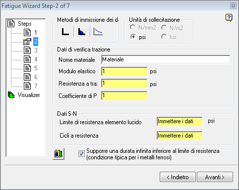 Se nel Passaggio 1 si è scelto di calcolare il fattore di sicurezza della fatica, occorre immettere gli stessi dati del metodo di calcolo della durata SN (modulo elastico, resistenza alla trazione, rapporto di Poisson, limite di resistenza e numero di cicli prima del guasto), con l'aggiunta dei requisiti necessari per descrivere la curva di durata infinita.