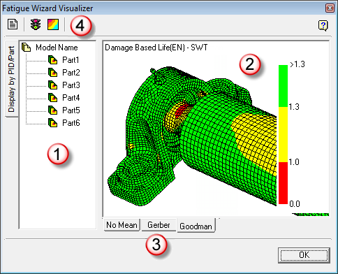 Accedere al visualizzatore della Procedura guidata Fatica da qualsiasi passaggio dell'analisi del browser (vista struttura) di un modulo. Il visualizzatore mostra il modello FEA di base o il modello FEA con i risultati della fatica contornati, a seconda della disponibilità dei risultati. Se viene eseguito il calcolo della fatica, il visualizzatore viene impostato per default su una visualizzazione contornata dei risultati.