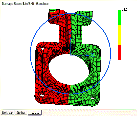 Il grafico a semaforo offre una panoramica delle aree del modello che mostrano risultati della fatica accettabili (verdi), appena sufficienti (gialli) e inaccettabili (rossi). La Procedura guidata Fatica fa riferimento al risultato desiderato immesso nel Passaggio 5 per determinare la banda in cui rientrano i risultati.