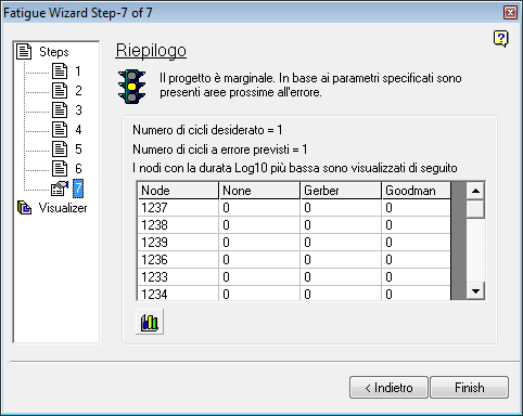Il passaggio 7 fornisce un riepilogo dei risultati calcolati della fatica. È una rapida indicazione dell'idoneità dei componenti a sostenere la condizione di carico applicata. Il simbolo del semaforo indica se i risultati sono accettabili, appena sufficienti o non accettabili quando confrontati con i valori desiderati immessi nel Passaggio 5.