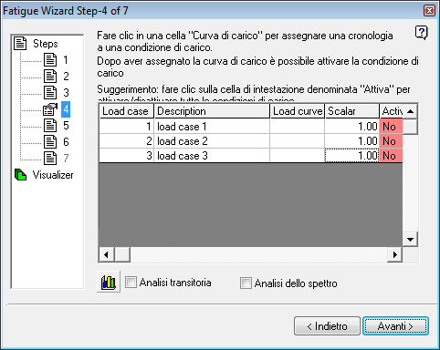 La Procedura guidata Fatica legge automaticamente i risultati di tutte le condizioni di carico analizzate nel modello FE. Utilizzare i metodi descritti nelle sezioni seguenti per attivare e disattivare le condizioni di carico, definire le singole curve di carico e definire i moltiplicatori scalari per ciascuna condizione di carico.