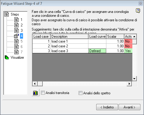 Se necessario, quando vengono definiti i dati della curva di carico per una condizione di carico, è possibile rimuoverli dal calcolo della fatica "disattivando" la condizione di carico. Fare clic sulla cella "Attiva" per modificarne lo stato.