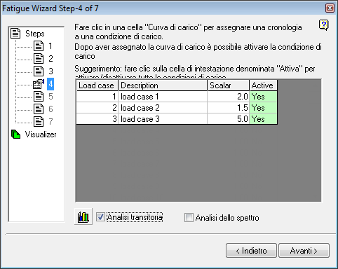 Per impostare un'analisi dello spettro, selezionare la casella "Analisi dello spettro". Quindi è possibile utilizzare l'icona standard di selezione dei file visualizzata per associare un file dello spettro. L'analisi dello spettro acquisisce i fattori di scala dalla finestra di dialogo del Passaggio 4, che effettuano la lettura dal file dello spettro per creare più cronologie di sollecitazione. Ciascuna di queste cronologie di sollecitazione discrete viene usata per calcolare un danno. Quindi il danno viene sommato al numero di ripetizioni della cronologia della sollecitazione, definito anche all'interno del file dello spettro. Un Danno/Durata totale viene quindi visualizzato sull'intero spettro.