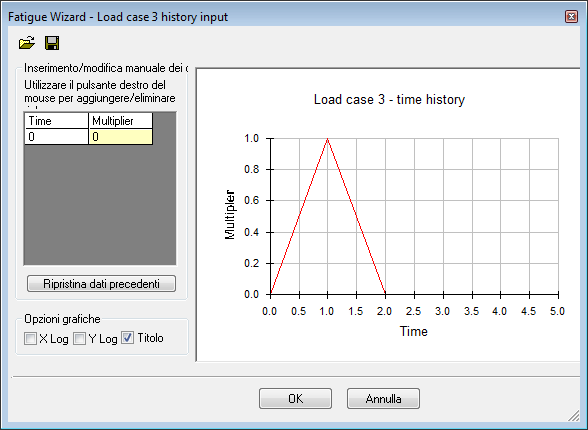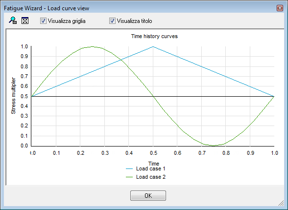 Per definire un evento ciclico e un calcolo della fatica, l'analista deve assegnare una "cronologia di carico" a ciascuna di queste condizioni di carico. La cronologia di carico descrive il modo in cui le sollecitazioni calcolate nel modello statico FE variano in base al tempo. Nella Procedura guidata Fatica, è possibile scalare e combinare una o più condizioni di carico tramite una "cronologia di carico" per creare le sollecitazioni cicliche finali.