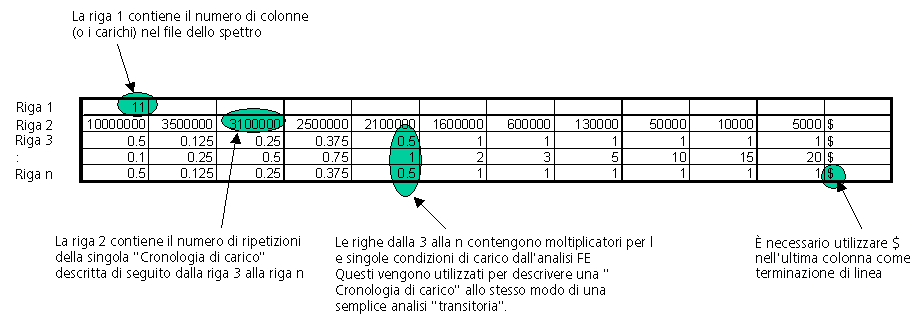- La riga 1 contiene il numero totale di carichi discreti che costituiscono il file dello spettro. In questo caso sono presenti 11 carichi discreti, pertanto sono presenti 11 colonne nel file dello spettro.