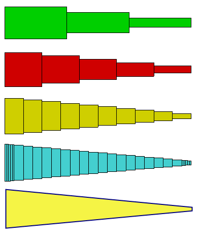 Figure 1: Variable Cross-Section Beam - four different mesh densities are shown to simulate a tapered beam with a variable height (bottom figure).