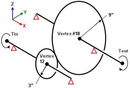 Analyze the gear train in Figure 2. Instead of trying to model the gears with beam elements to mimic the rotational connection, use Multi-Point Constraints. For the gears, Radius1*rotation1 = -Radius2*rotation2. So the MPC equation is Radius1*rotation1 + Radius2*rotation2 = 0. For the dimensions and vertex numbers given, the input for the MPC is as follows: