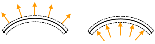 Although the areas of the top and bottom sides of the element are equal in the stress-free condition, large displacement effects can stretch the two surfaces differently. Thus, although uniform pressures of -1000 on the top and 1000 on the bottom may appear to be identical graphically, the results can be different. A similar situation occurs with hydrostatic pressure loads. In addition, for inclined or curved surfaces, taking the thickness into consideration changes the effective fluid depth where the fluid contacts the elements, and therefore affects the hydrostatic pressure (depending upon whether the load is applied to the top or bottom face of the elements). See the figures below.