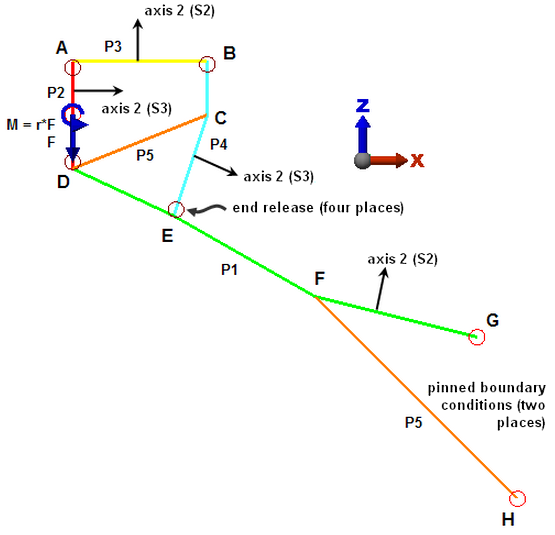 The model is planned as in Figure 2. The orientation of the model can be in any direction since beam elements are three dimensional, but let's use the XZ orientation of the model shown in Figure 2. (This makes the Front view natural.) The different part numbers are shown (P) based on the above table.