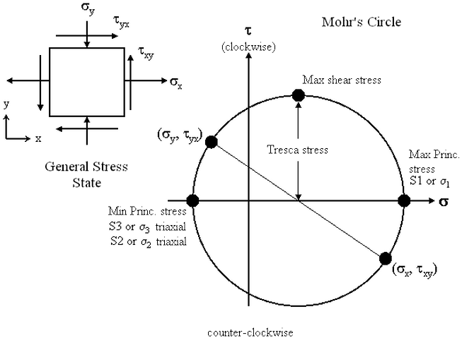 Mohr's circle is a graphical method of visualizing the stress state at a point for various directions (planes). The principal stresses occur on a plane where the shear stress is zero. The maximum shear stress (or the Tresca stress) is equal to the radius of the circle (= 0.5*(maximum principal stress - minimum principal stress)). The stress intensity range is commonly used in pressure vessel design and is defined as (maximum principal stress - minimum principal stress). Since this is the diameter of Mohr's circle, the stress intensity range is equivalent to the Tresca*2 stress that is plotted in the Results environment.