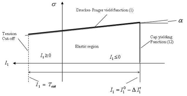 The Drucker-Prager yield criterion does not take into account two properties of geological materials. First, most geological materials provide little or no resistance to tensile loads. Second, the yield surfaces and strengths of geological materials often depend on the pressure loads. The Modified Drucker-Prager material model will account for these properties. This model includes three sections as shown in Figure 2. The area where I1 is larger than the tension cut-off, Tcut, is defined as the tension cut-off region. The region where I1 is less than the cap yielding function defined as the cap hardening area.