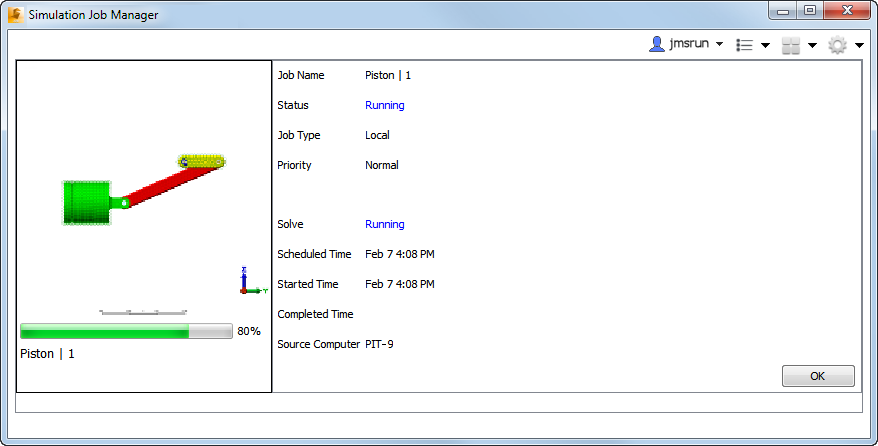 - Details: Opens a detail view of the selected job. The detail view lists the status; job type; priority; scheduled, started, and completed time; source computer; and the thumbnail image of the model. While running, a progress bar indicates the progress of the simulation. Click OK to close the detail view. An example of the Detail view is shown in the following image: