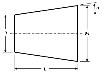 α = taper angle (user input). Tan(α) = (De - D)/2/L