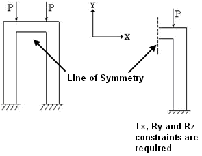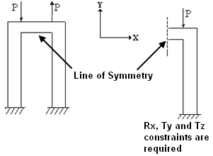 Symmetry exists in a model when the geometry, loading and results are symmetric about a plane. If symmetry exists in a model, it is only necessary to model half of the model (or some other portion). When working with symmetric models, apply the correct boundary conditions along the plane of symmetry. Constrain the out-of-plane translation and the two in-plane rotations as shown in the following image. When applying boundary conditions, there are three buttons to automatically apply symmetry boundary conditions along the global planes. These buttons refer to the vector normal to the symmetry plane. For example, the X Symmetry button will apply symmetry boundary conditions along the YZ plane.