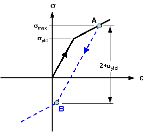 Uniaxial stress-strain curve. If the part is taken beyond the yield stress, it begins to deform plastically. If taken to a maximum stress (point A) and the load is released, it unloads along the dashed line. If the part is loaded again, no additional plastic deformation occurs until the stress reaches point A.
