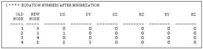 How do the terms in the stiffness matrix correlate to the model and the nodes? This can be understood from Figure 3. The DOF, which stands for degree of freedom, is related to a particular node and motion: either a translation or a rotation. This correlation can be determined by printing the equation numbers with the Global: Output: Equation numbers data option. Figure 4 shows a sample printout of the equations numbers, which appears in the summary file (.ML). In some cases, it may be easier to avoid the bandwidth minimization (Global: Options: Avoid bandwidth minimization).