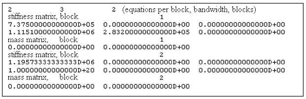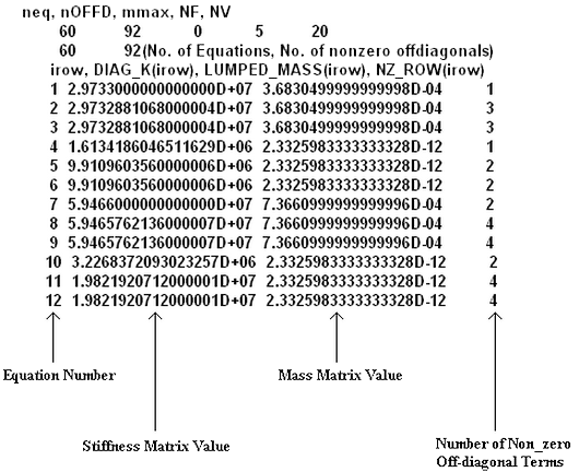 Therefore the first section defines the diagonal of both the stiffness and mass matrices. Since the mass matrix has no non-zero values away from the diagonal, the mass matrix is completely defined. The second section consists of 3 columns as shown in Figure 6.
